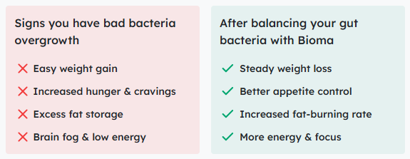 Bioma is neither a fat burner nor a weight loss pill. It’s a scientifically-formulated probiotic that helps you rebalance your gut bacteria, improve gut health, and restore your body’s natural ability to burn fat. Unlike fat burners and weight loss pills, it’s also completely stimulant-free, meaning it won’t cause jitters, headaches, dizziness, or nausea typically associated with these products.
